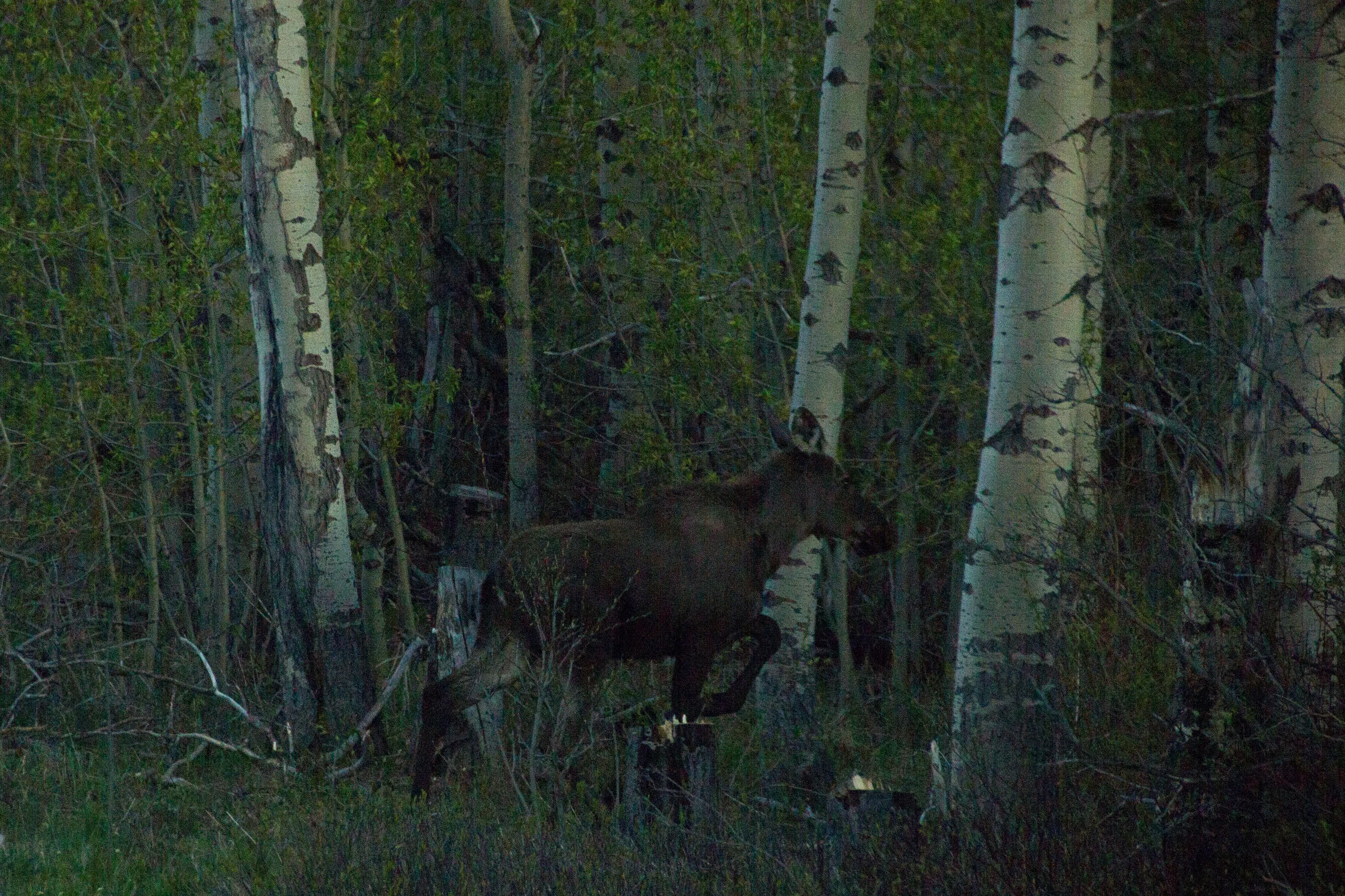 On the drive back we saw a female moose preparing to cross the street in front of us as we rounded a bend. Sam stopped in time and I attempted to take a photo before she disappeared, but I realized the settings were all wrong just a moment too late. Luckily Adobe Lightroom could still produce this photo of our moose after we adjusted all the settings a lot.
